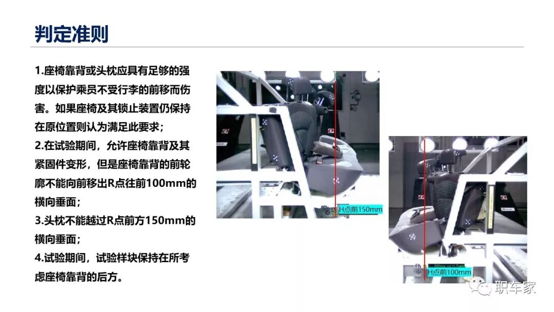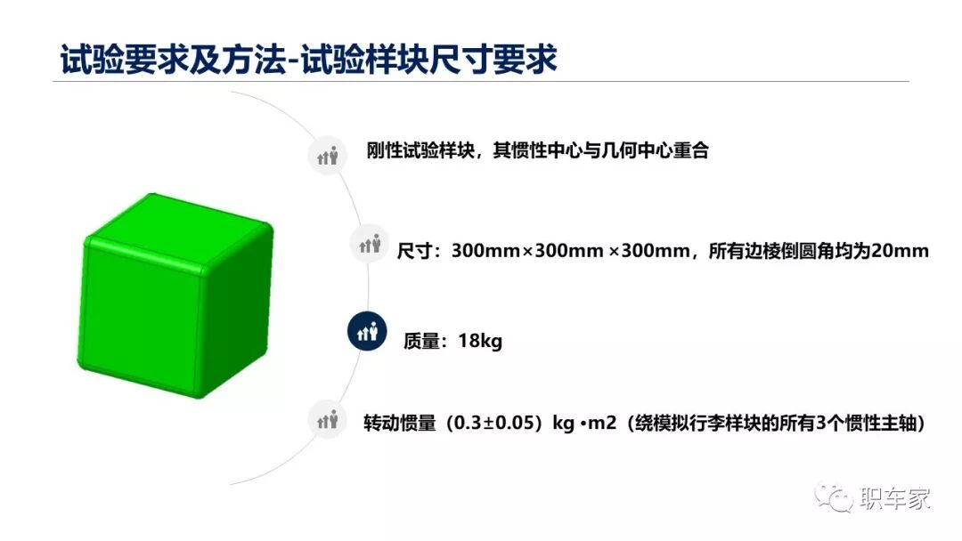 行李箱冲击试验主要目的是防止移动的行李对后排乘员伤害的特殊规定,针对两厢车型行李舱的座椅靠背或头枕应具有足够的强度以保护乘员不因行李的前移而受到伤害,试验是以动态验证座椅的固定点强度及座椅拘束装置的耐惯性力。