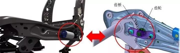 座垫高度调节:扇形齿板作为四连杆的驱动端与(后横梁)联接,通过电机上的齿轮带动扇形齿板旋转,从而带动四连杆运动,实现座椅升降。这里电机齿轮和扇形齿板的间隙精度控制最为重要,齿间的间隙如果大于0.3mm时,座椅调节的时候就会产生抖动、异响等问题。所以两边的齿板冲压出的安装孔就需要冲压工程师费心了。