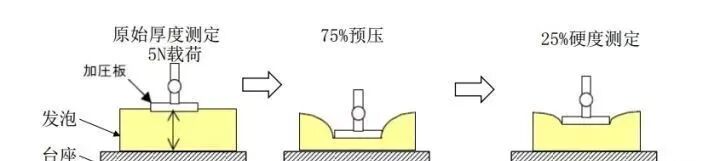 发泡硬度是决定座椅乘坐性(舒适性)的重要参数。座椅发泡硬度一般采用25%压陷硬度测定法( 25% ILD:Indentation Load Deflection)直径200mm的加压板,用5N的载荷对于发泡从发泡原始厚度开始预压缩75%,然后再压缩25%并保持20s,并记录其载荷值则为25%硬度值N/314cm2