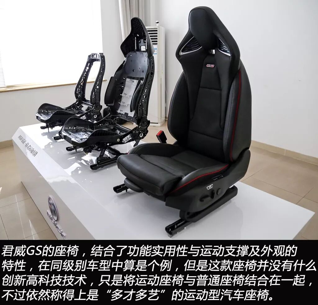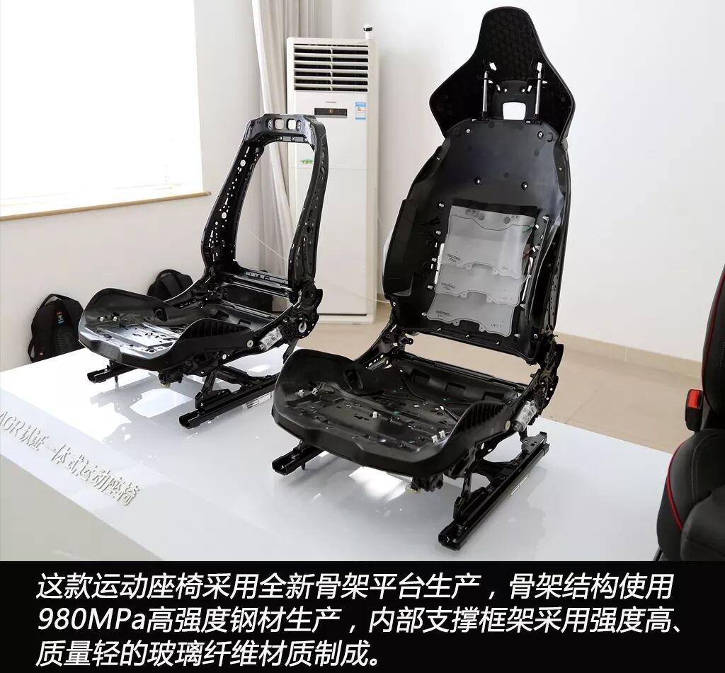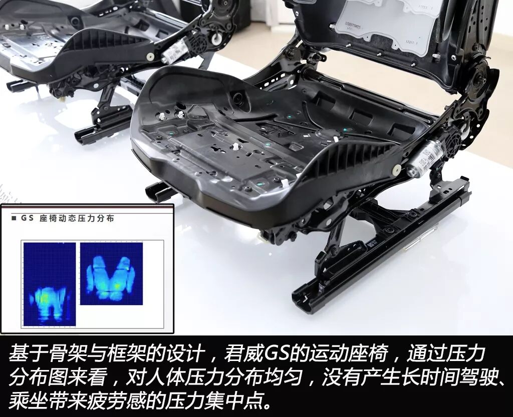 君威GS的运动座椅强调了运动性能,同时保留乘坐舒适性、座椅功能性。首先,从座椅骨架来看,这款座椅基于全新骨架平台生产,整体结构使用980MPa(代表材料的屈服强度)高强度钢材生产,重量更轻,质量更强。座椅靠背和坐垫及侧部支撑的框架,则采用玻璃纤维材质制成,具有机械强度高,吸能性与高速碰撞表现较好,耐久性高和高温变形小的特点,而且重量相比金属结构框架更轻,运用了全盘一体化注塑工艺成型。
