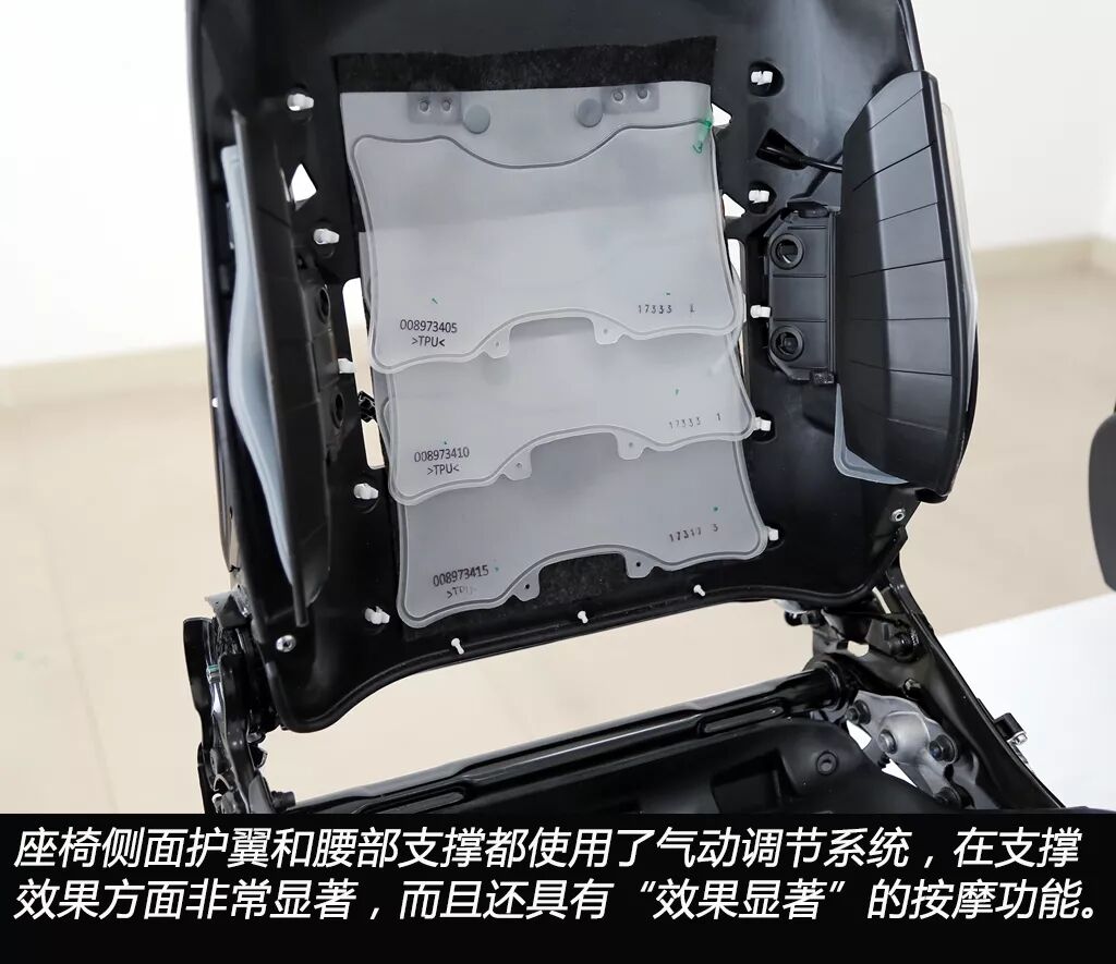 在支撑方面,座椅侧翼和腰部支撑都使用了气动调节系统,这两项可以说是君威GS座椅的“功臣”。工程师使用了3个气囊袋组成了整个腰部支撑系统,上下调节行程达到了140mm,前后调节为70mm,与传统腰托相比,调节行程更大。而且,通过收放气可实现按摩功能,力度“不糊弄”。然而,座椅侧面支撑也同样使用了气动调节,收紧与释放范围较宽裕,以达到不同身材驾乘人员,都能抵抗激烈驾驶时的横向G力。