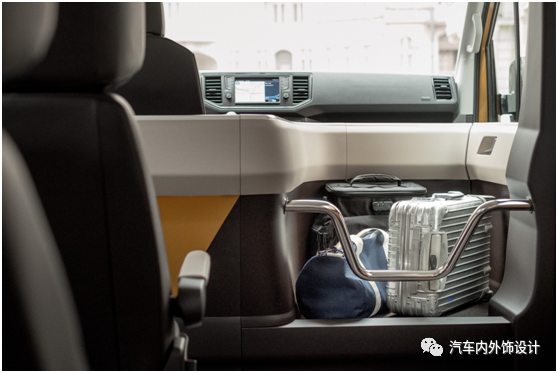 内饰方面,新车前中控台造型与现款T6基本保持一致,但由于功能需要仅保留了驾驶席位,副驾驶座椅位置进行改造,可以放一些行李箱等物品,从而实现了更宽阔的使用空间。后排一改商务的气息采用了1+1+2+3的座椅布局,副驾驶位置被设计为行李放置区域。这款车独立样式的副驾驶确实很宽敞,放置一些用品在这个位置很合适。这款车的布局上文我们已经提到了,是非常另类的设计。