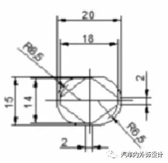 定位异型销/孔应具备防转功能,若定位基准销/孔为正方形或腰形,推荐定位销设计成菱形销,菱形销的定位面/检测面的有效长度不小于1mm,推荐2mm以上,如图5所示,例如:腰形定位孔尺寸为20*15,短边尺寸15为定位尺寸,位置度公差为1,长边尺寸为20为检测尺寸,位置度公差为2,定位端为直边(定位尺寸14),有效长度2mm,检测端尺寸为圆弧(圆弧为R6.5,检测尺寸为18),有效长度2mm,菱形销结构推荐按照图5设计。