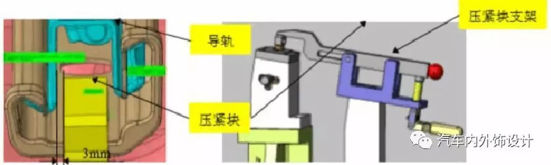 压紧块与座椅导轨单边距离至少为3mm(如图6所示),且压紧块的尺寸公差为±0.2mm(应在检具总装图纸中体现)。