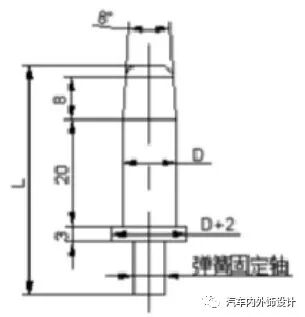 锥形销分为插拔式结构和滑动式结构,优先考虑用滑动式结构,插拔式结构按图3设计,滑动式锥形销由定位部分、导向部分等组成,导向部分的长度为15mm-20mm,底部安装弹簧,锥形销在非工作状态时要求弹簧处在预压缩状态,锥形销底径D的计算公式: