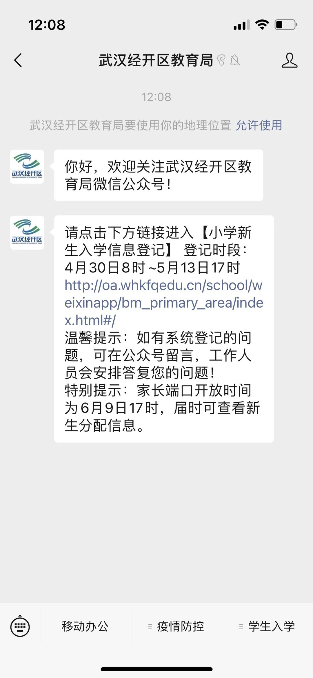 微信扫码关注“武汉经开区教育局”公众号,导航菜单点击“学生入学”>“小学新生入学”,按照系统提示进行信息登记。