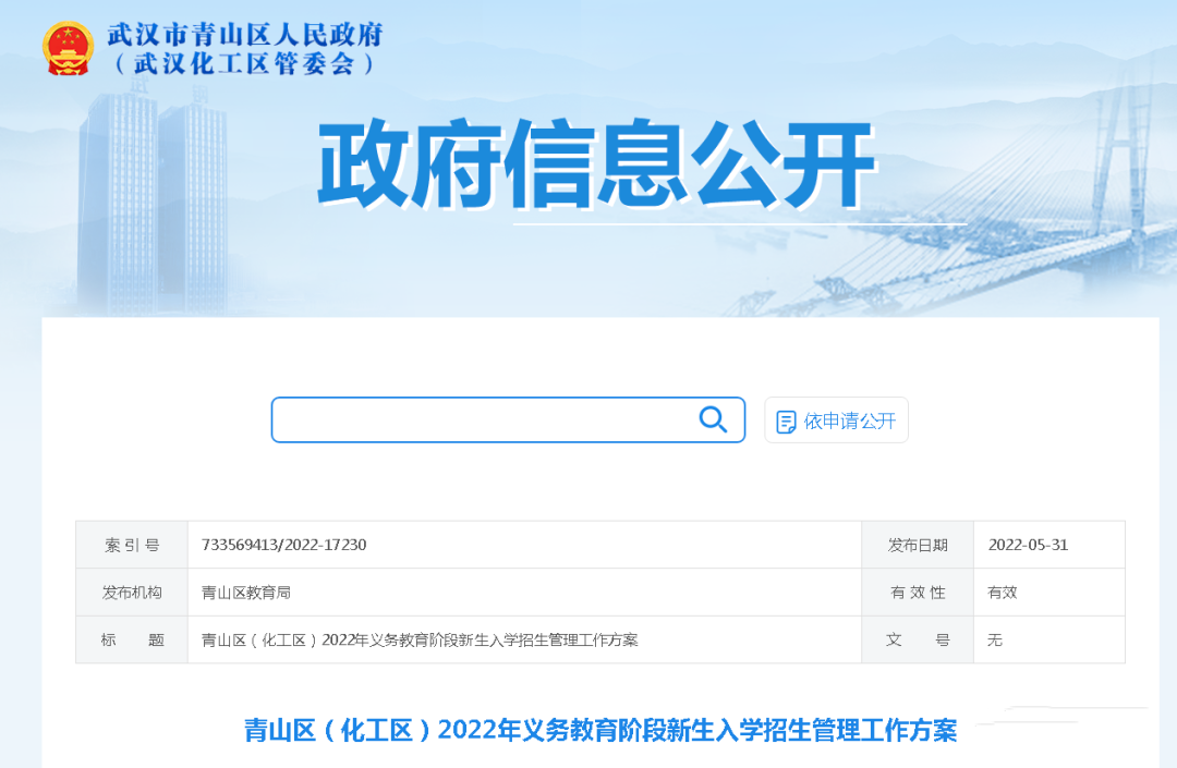 5月,各小学及九年一贯制学校小学部在校门口公示学校服务范围、新生入学工作安排等信息。家长们可以登录“武昌区小学入学查询系统”,在线查询对口服务范围,了解就读学校。