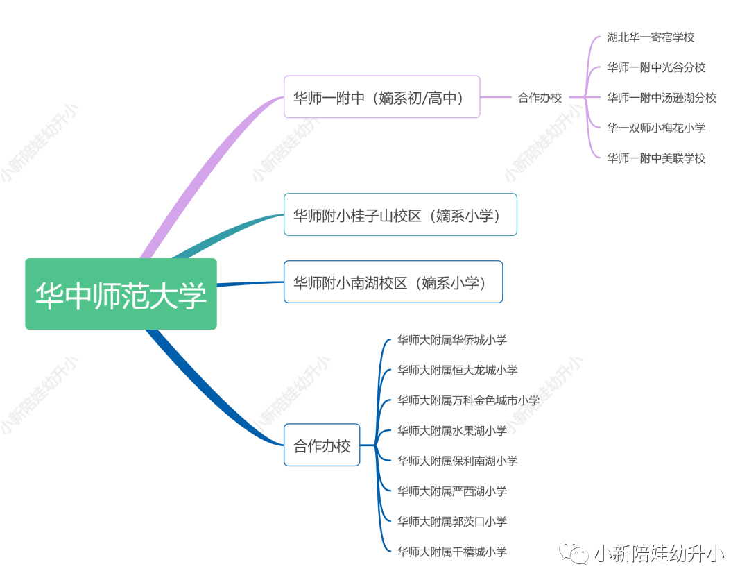 从上图的所属关系来看,“华师系”中小学分为华中师大管理和华中师大一附中管理两种模式,而华师附小并没有办任何分校。