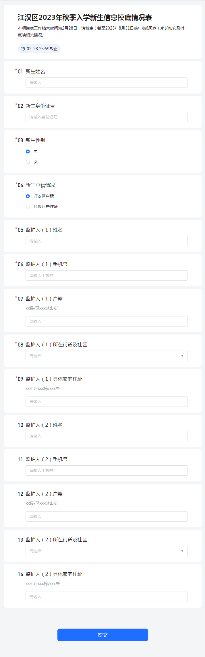 请2023年有新生入学需求的居民真实、及时填写,该系统为网络填报系统,通过微信扫码进入系统后填报,填报后区教育局后台进行统计,填报时间自系统表格下达之日起,截止时间为2月28日。