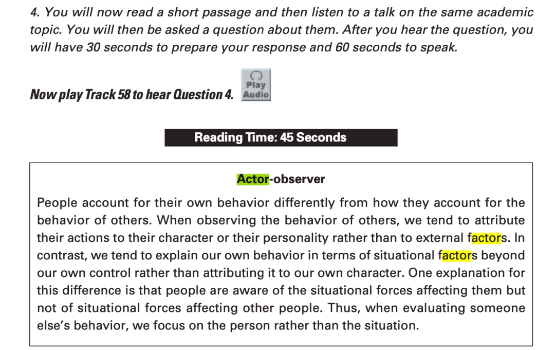 阅读完passage,听完lecture后,我们先explain the terms —— actor observer,然后总结听力段子去解释这个terms口语转化表达