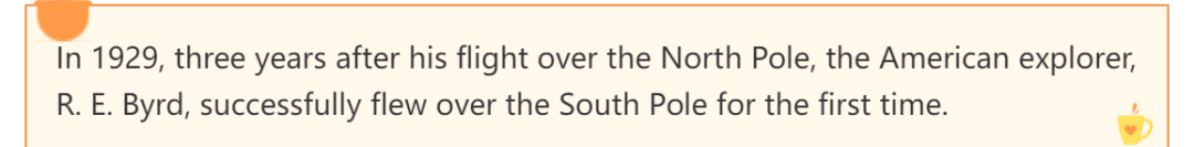 In 1929|, three years | after his flight | over the North Pole,| the American explorer, | R. E. Byrd, successfully flew over| the South Pole| for the first time.