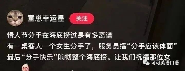 小华:我按照计划一个人去海底捞吃饭,结果变成了“庆祝分手”,员工们出乎意料地围在我的桌子旁,唱着梁静茹的《快乐分手》。有趣的是,一名员工甚至举着一个牌子,上面写着“高富帅”,意思是“高大、富有、英俊”,祝愿我找到更好的另一半。