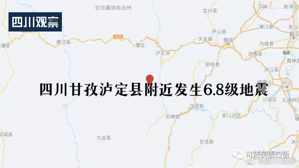 中国西部四川省山区发生6.8级地震。震中位于泸定镇,震源深度16公里,位于四川成都西南约180公里处。
