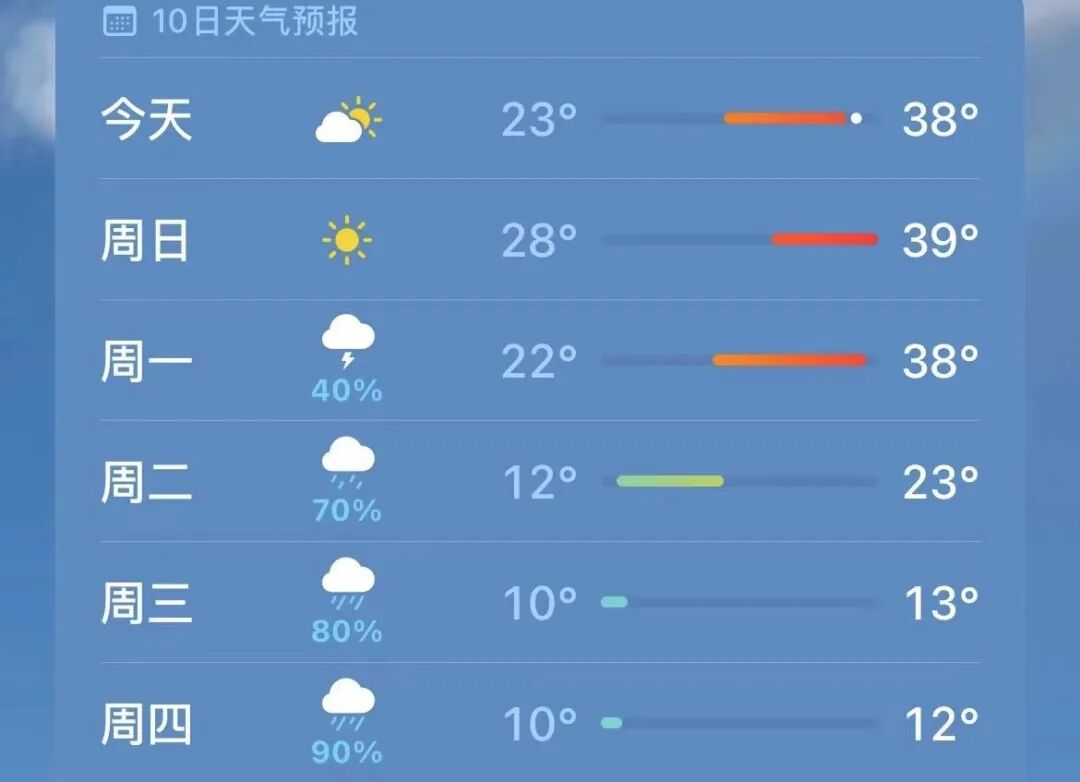 “The heat wave in the south is forecast to linger until Tuesday, with daily maximum temperatures of 35 ℃ to 37 ℃ in many areas. In some locations, the daily high temperature could go beyond 40 ℃....” said the weather broadcaster on TV. “...the drop in temperature will be as much as 18 ℃ in some places, ...”