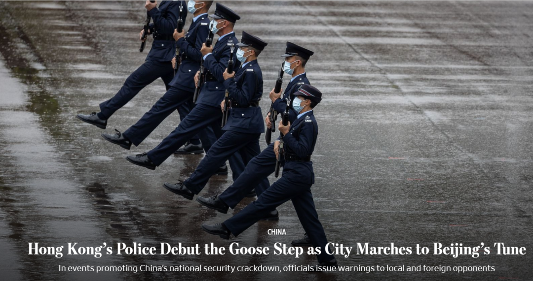 Xiaohong:A Hong kong police drill squad is marching with goose-stepping in the locked-knee marching style of Chinese military.