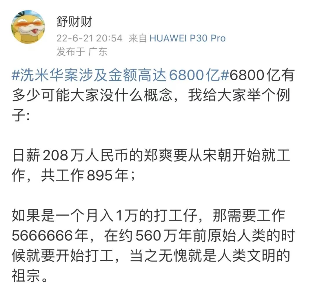 那可是一大笔钱啊!这意味着演员郑爽要从宋朝开始工作895年。以我为例,如果我的月薪是10000元,我必须工作560多万年。