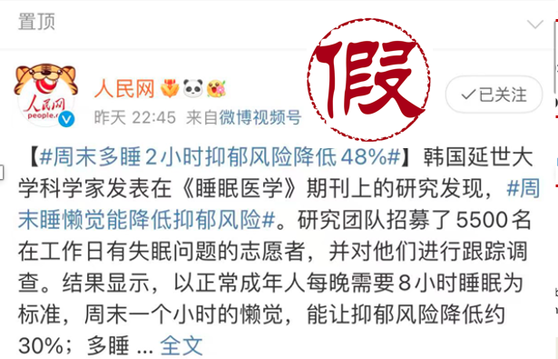Does sleeping in late on weekends make you feel good? According to People’s Daily, sleeping in late on weekends can cut off the risk of depression in half. But after I read the journal, I came to realize that this piece of news was fake. It is weekend catch-up sleep that reduces the risk of depression. From this point, we are easily deluded(欺骗).