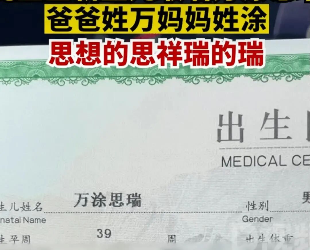近日,湖北宜昌万先生在网络上分享刚出生儿子的出生医学证明,名字是万涂思瑞,也是英文123的谐音。网友纷纷评论后,万先生回应称,万涂思瑞名字由来,自己姓万,孩子妈姓涂,虎宝宝又得有山有王,就用了祥瑞的瑞,思是有思想,连在一起读,碰巧也是英文123的意思,虎宝宝遇王则贵,遇山则顺。今天我们就来聊聊和这一则新闻相关的知识。