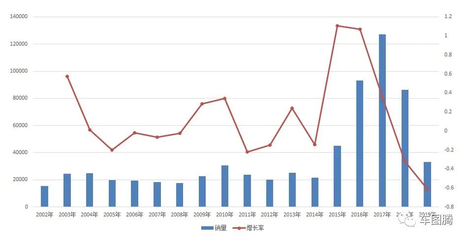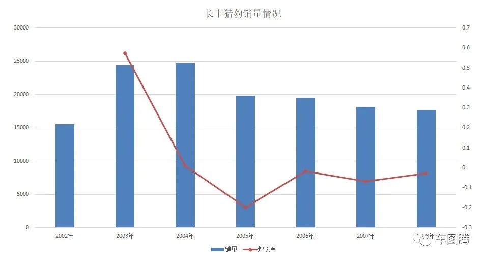 2002年后,中国车市迅猛发展,但长丰猎豹的年销量也一直非常平缓,2002年到2008的7年时间里,一直在2万辆左右徘徊。