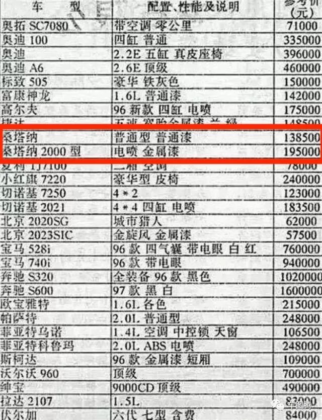 此外,两者的价格也有较大差异。据车图腾获得的一份90年代汽车报价单显示,普桑的售价为13.85万元,桑塔纳2000则达到了19.5万元。当那个万元户都稀缺的年代,这样的售价可是相当高昂了。甚至在当时的北京、上海,都能买到房。