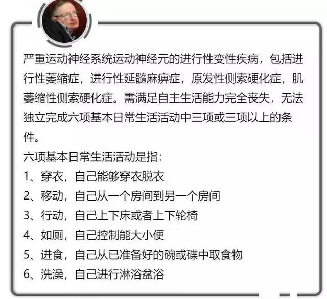如果渐冻症患者发展到以上6项中,那就符合保险理赔范畴了。由此可见,霍金那种情况如果他也购买了重疾险的话,是能够赔付的,虽然这种病无法治愈,但是足够的钱也能使得患者体面的活着。