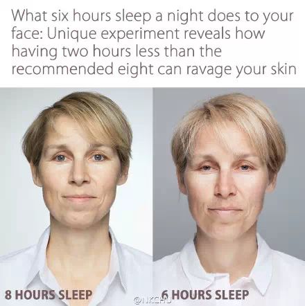 据《每日邮报》报道,46岁的Sarah Chalmers参加了英国伦敦的一个睡眠学校的实验,连续五天只睡6个小时与睡满8个小时的面容对比照(如下图)。