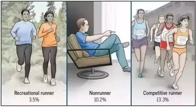 《美国骨科与运动物理治疗杂志》中的一篇研究文章讲到:“健身跑的人们关节炎发生率仅3.5%,而选择静息生活方式、久坐不动人群的关节炎发生率却为10.2%,竞技体育的赛跑者的关节炎发生率13.3%”。