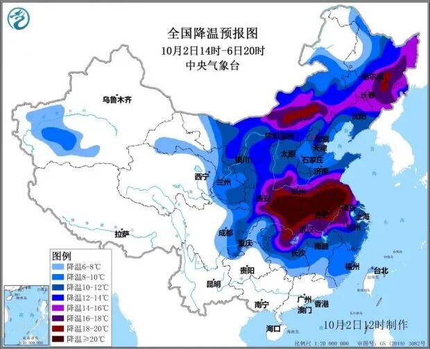 据中央气象台网站消息,预计,10月2日至6日,强冷空气将影响我国中东部大部地区,带来大风和强降温天气。中央气象台2日上午发布寒潮蓝色预警,也是今年下半年首个寒潮预警。