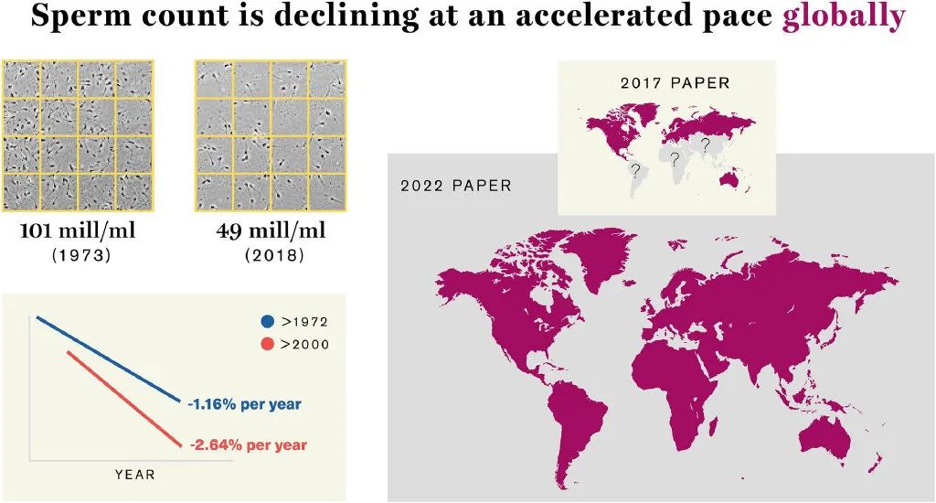 全球男性平均精子数量下降62%,精液中的精子浓度下降51.6%。