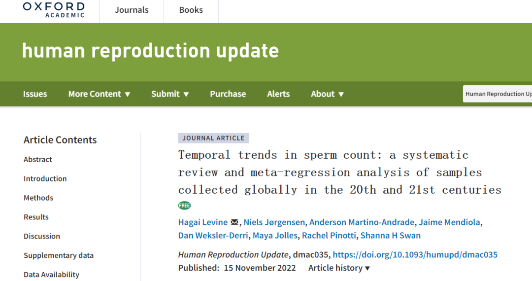 11月15日,以色列耶路撒冷希伯来大学教授哈盖·莱文领导的研究团队在《人类生殖更新》期刊发表论文称,1973年至2018年间,全球男性平均精子数量下降了62%。