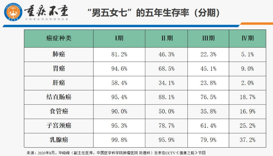 中国成人男女高发癌症五年生存率