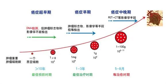 一个癌细胞,需要不断的分裂增殖,数量引发质变才有可能变成癌症,目前发现要长到1公分大小,才容易被常规的临床检查所发现,以1公分为界,那这是个什么概念呢?1毫米大小,约相当于100万个癌细胞聚在一起,10亿个癌细胞,也就是10个9次方,聚在一起,大小约为1公分。因此,一般癌症的发生要经历数十年的时间,所以我们常说“癌症是突然发现的,但是不是突然发生的”。