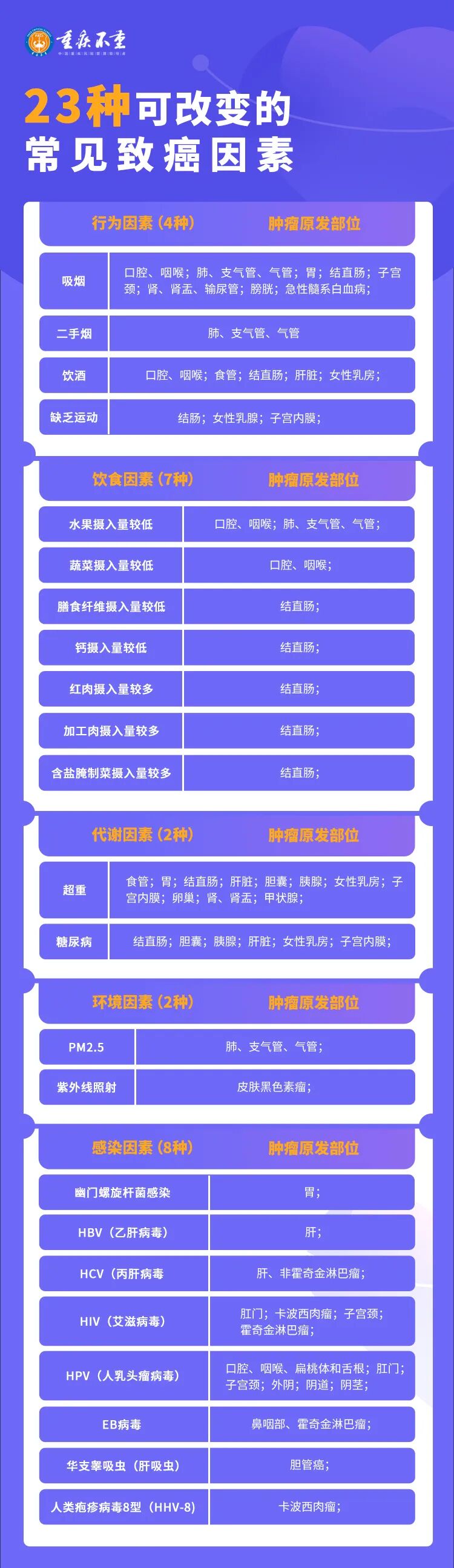 早在2019年,国家癌症中心/中国医学科学院肿瘤医院赫捷和陈万青在柳叶刀杂志在线发表了一项重要研究结果,该研究分析了中国大陆31个省,自治区和直辖市(以下称省)中成年人23种可改变的常见致癌风险因素,可以分为行为因素,饮食因素,代谢因素,环境因素及感染因素等5大类。