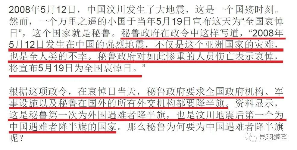 正是因为秘鲁与华夏之间渊源颇深,难怪秘鲁有许多国民自称祖先3000年前来自中国。也难怪汶川5.12地震时,秘鲁举国哀悼,降半旗,并将5月19日定为国难日。