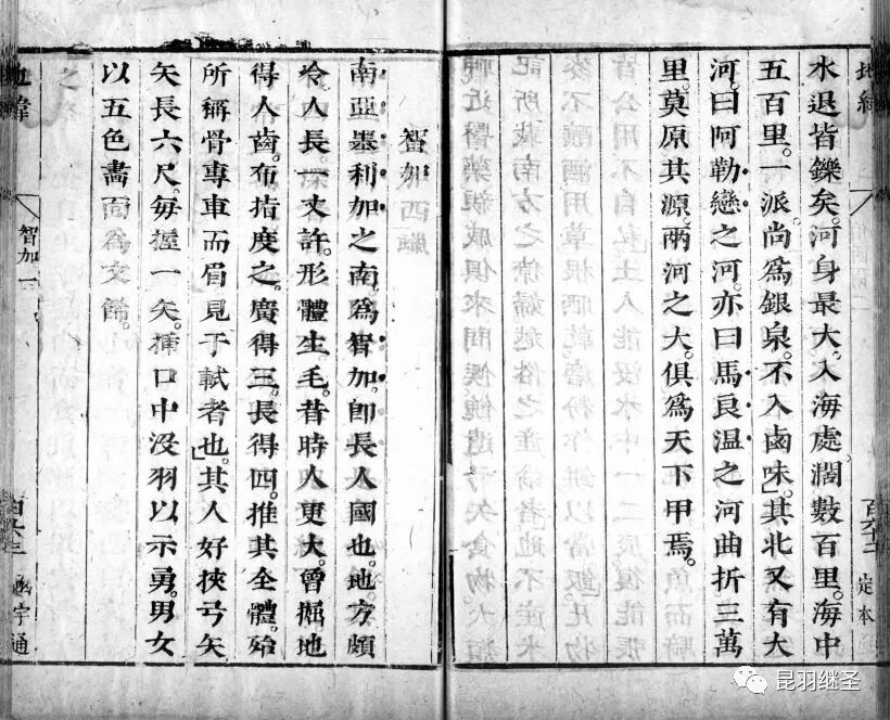 智加:南亚墨利加之南为智加,即长人国。地方颇冷,人长一丈许,遍体皆毛。昔时人更长大,曾掘地得人齿阔三指,长四指馀,则全身可知。其人好持弓矢,矢长六尺,每握一矢,插入口中,至没羽以示勇。男女以五色画面为文饰。