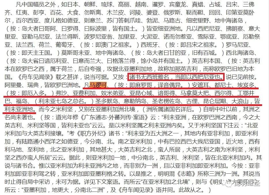 非洲诸国:根据《海国四说》记载,凡马逻可(即麻罗哥,译音偶异)、安遮耳、都尼士、埃岌多(即厄入多)、弗沙、亚费利加、奴米弟亚、亚昆心域、谙哥得、马拿莫大把、西尔得、工鄂井巴、福岛、(利未亚七岛之总名)圣多默岛、意勒纳岛、圣老楞佐岛、古俚、昆仑层期、大浪山,皆利未亚洲(非洲)地。就不多说了。