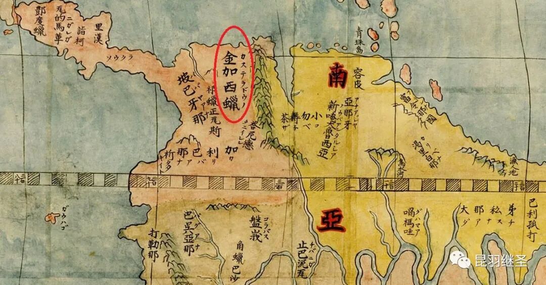 金加西蜡:南亚墨利加之北曰金加西蜡。其地出金银,天下称首矿。有四坑深者二百丈。土人以牛皮造软梯下之。役者常三万人,所得金银,国王什取其一,七日约得课银三万两。其山麓有城,名银城。百物俱贵,独银至贱。贸易用银钱:五等大者八钱,小至五分金钱。四等大者十两,小者一两。欧逻巴自通道以来岁岁交易,所获金银甚多。故西土之金银渐贱。其南北地相连处名宇加单,近赤道北十八度之下。南北亚墨利加从此而通,东西二大海从此而隔。周围五千馀里。天主教未至,其国预知,敬十字圣架。国俗以文身为饰。