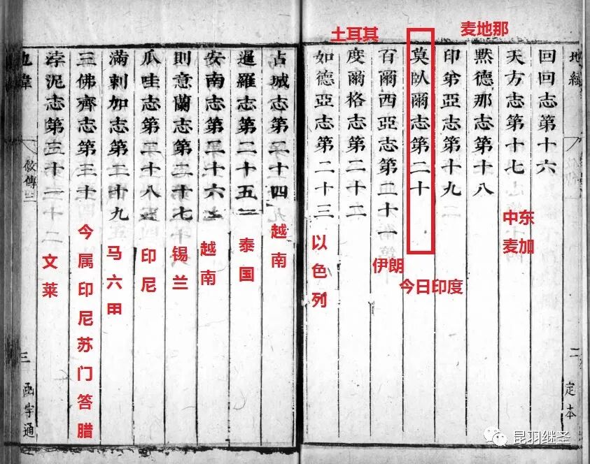 根据意大利传教士艾儒略 (Giulio Aleni,1582年—1649年,字思及)所著《职方外纪》(书成于天启癸亥年,即元始1623年)和《坤舆万国全图》来考察一下下列地名。
