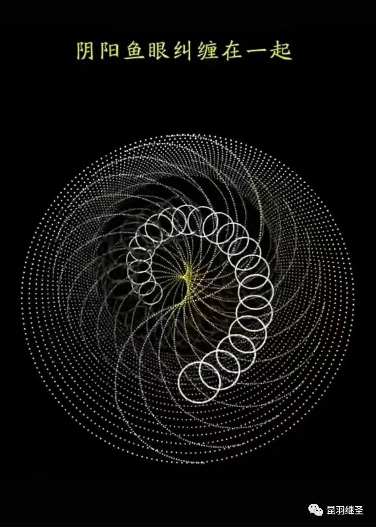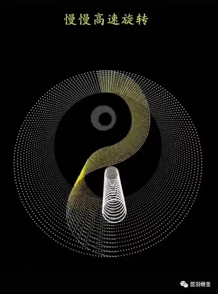 当把太极图旋转起来,且速度越来越快时,阴阳鱼眼会出现叠加态,——注意,此举是实际是在模仿宇宙天旋地旋之道。