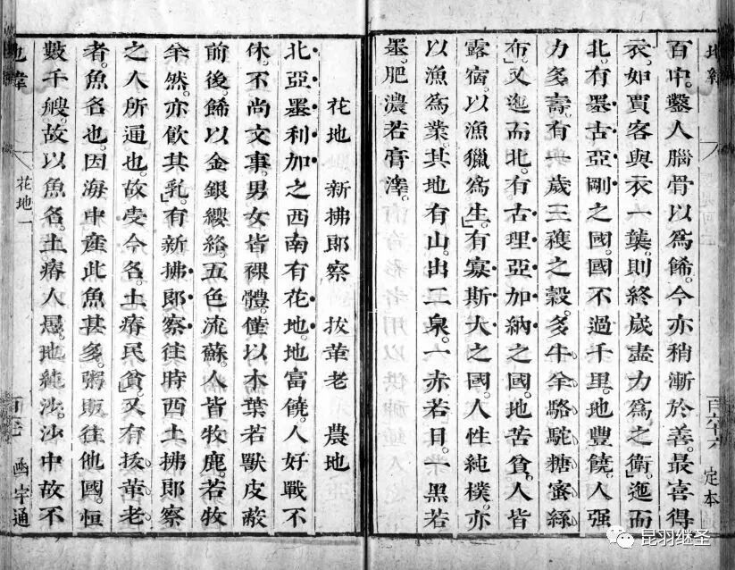 昔年土俗事魔,杀人以祭,或遭灾乱,每岁辄加祭法以绿石为山,寘人背于上,持石刀剖取人心,以掷魔而肢体则分食之。所杀人皆取于邻国,故频年战𩰚不休。今欧逻巴传教士人感以天主爱人之心,知事魔谬不复祭魔食人。中有一大山,山谷野人最勇猛,一可当百,善走如飞,马不能及;又善射,人发一矢彼发三矢,百发百中,亦喜啖人肉,凿人脑骨以为饰。今渐习于善,最喜得衣。如商客与衣一袭则一岁尽力为之。防守迤北有墨古亚刚,不过千里。地极丰饶,人强力多寿生。一种嘉谷一岁可三熟。牛羊、骆驼、糖蜜、丝布尤多。更北有古里亚加纳地,苦贫人皆露卧渔猎为生。有寡斯大人性良善,亦以渔为业。其地有山出二泉稠腻如脂膏一红一墨色。