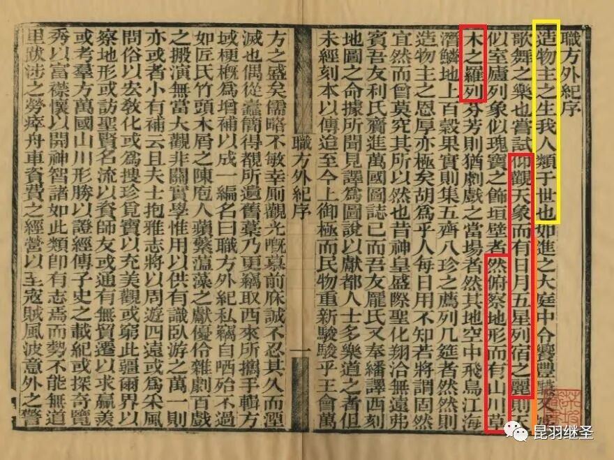 其实,即便是《职方外纪》的序,也是从《函宇通》中润色改动而来,比如,第一句“造物主之生我人类于世也”,与“天下一大州也,人类肇生之地,贤圣首出之乡”,有种莫名的撞衫感。而后面的“仰观天象”、“俯察地理”,这些都是华夏常常挂在嘴边的口头禅,也是身体力行的长期习惯。