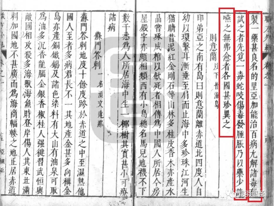 “制一药,甚良,名“的里亚加”,能治百病,尤解诸毒,有试之者先觅一毒蛇咬伤,毒发肿胀,乃以药少许咽之,无弗(不)愈者,各国甚珍异之。”