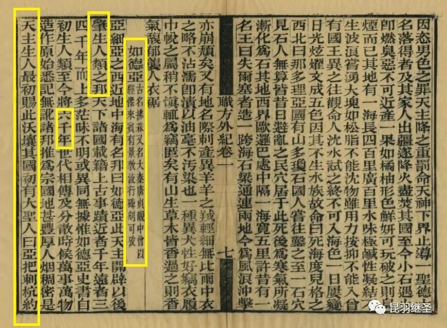 “亚细亚之西,近地中海有名邦曰如德亚,此天主开辟以后,肇生人类之邦。天下诸国载籍上古事迹近者千年,远者三四千年,而上多茫昧不明或异同无据,唯如德亚史书自初生人类至今,将六千年,世代相传……”