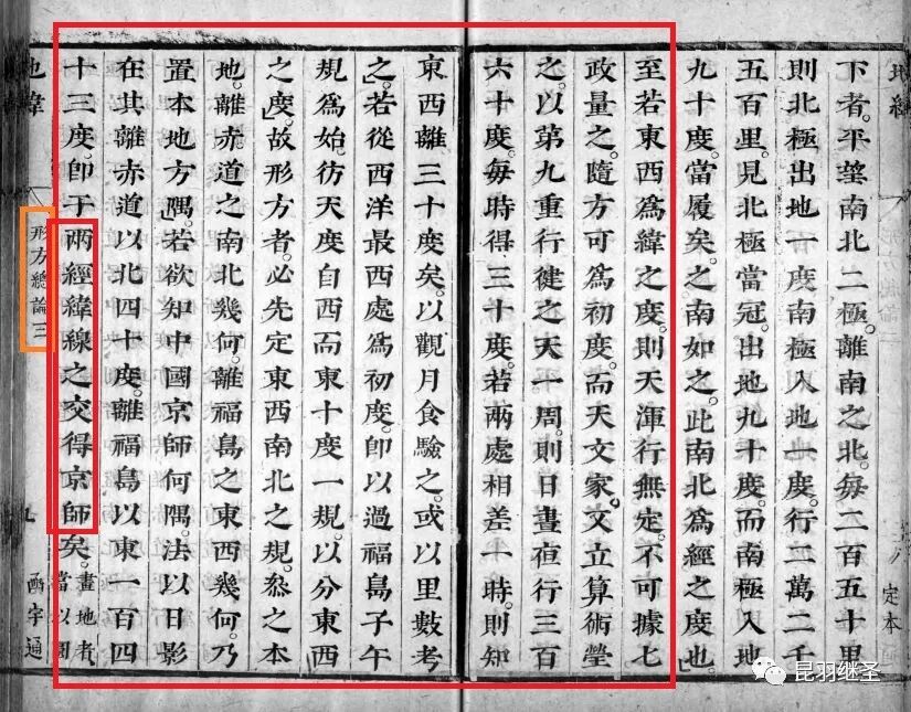 故形方者,必先定东西南北之规,叅(参)之本地。离赤道之南北几何,离福岛之东西几何,乃置本地方隅(传教士改成“方位”)。若欲知中国京师何隅,法以日影,在其离赤道以北四十度,离福岛以东一百四十三度,即于两经纬线相之交,得京师矣。”