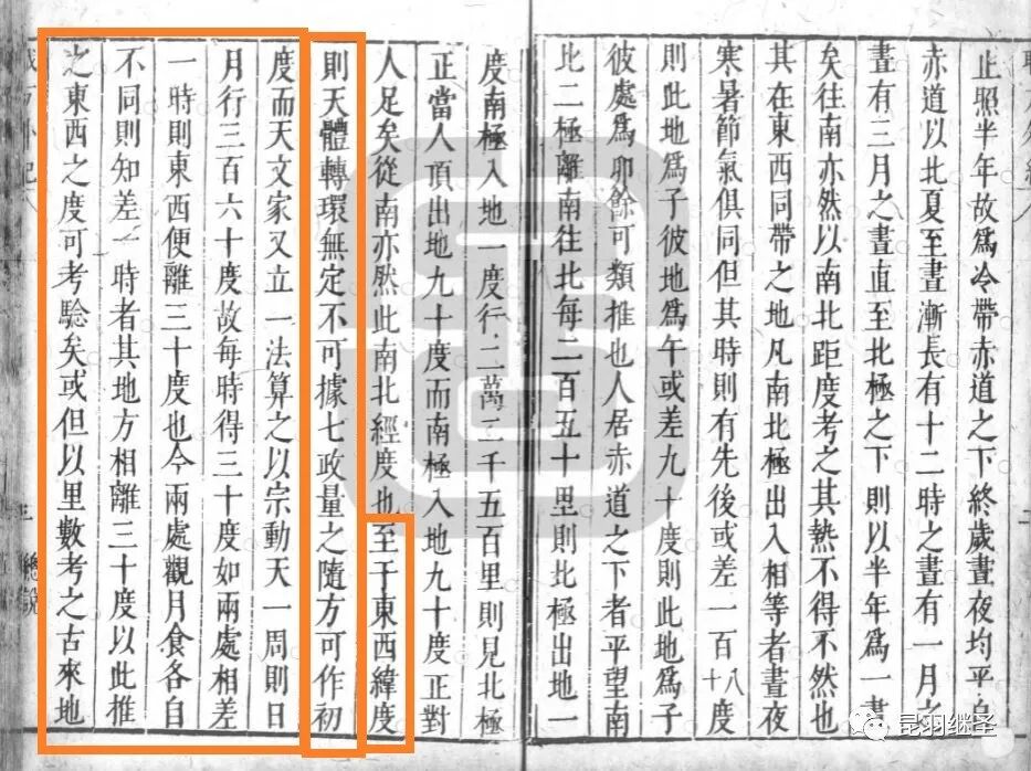 “至若东西为纬之度,则天体浑行(传教士改成“转环”)无定。不可据七政量之。随方可为(传教士把“为”改为“作”)初度,而天文家又立算术瑩之。以第九重(即宗动天,传教士改为“宗动天”)行健之天一周,则日昼夜行三百六十度,每时得三十度,如两处相差一时,则知东西离三十度矣。以观月食验之,或以里数考之。
