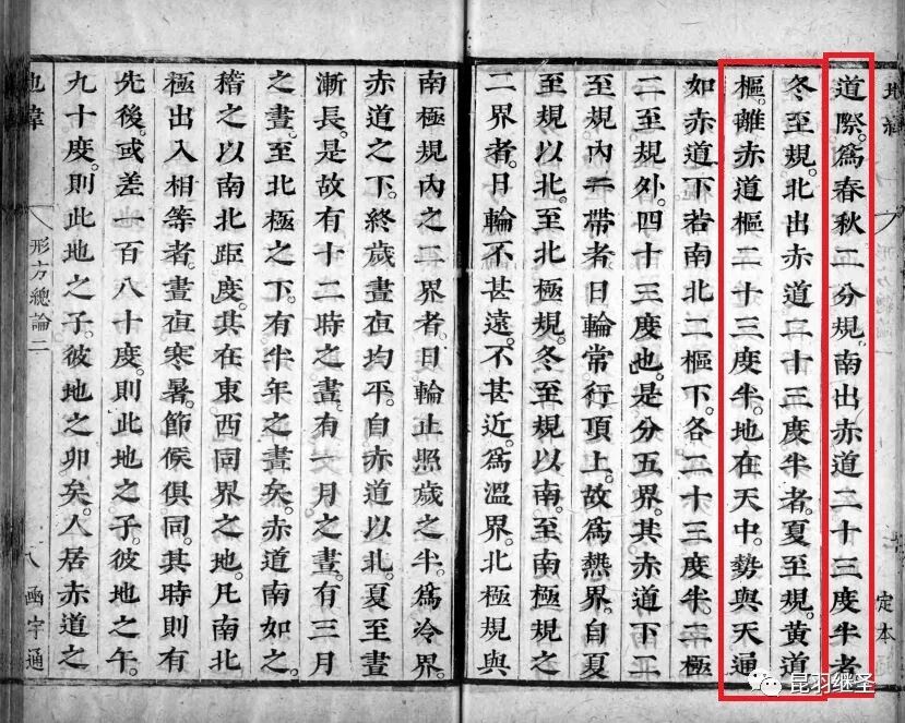“……如赤道下若南北二枢下,各二十三度半。二极二至规外,四十三度也。是分五界。其赤道下,二至规内,一带者日轮常行顶上,故为热界。