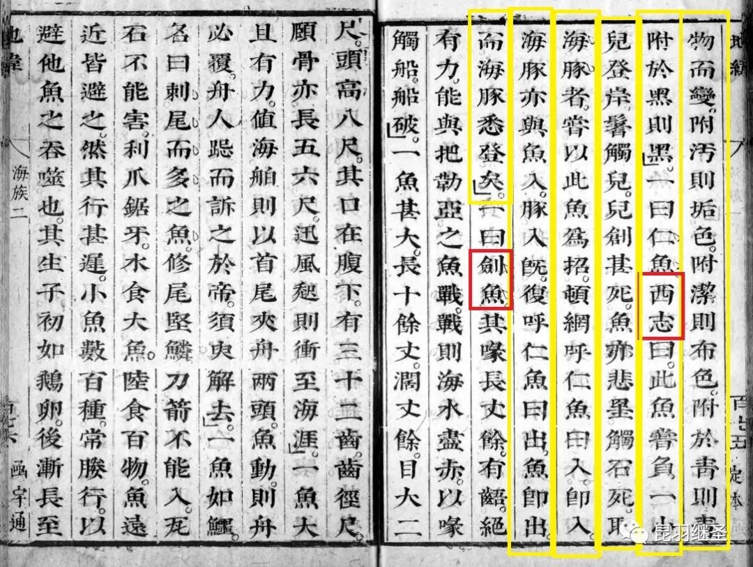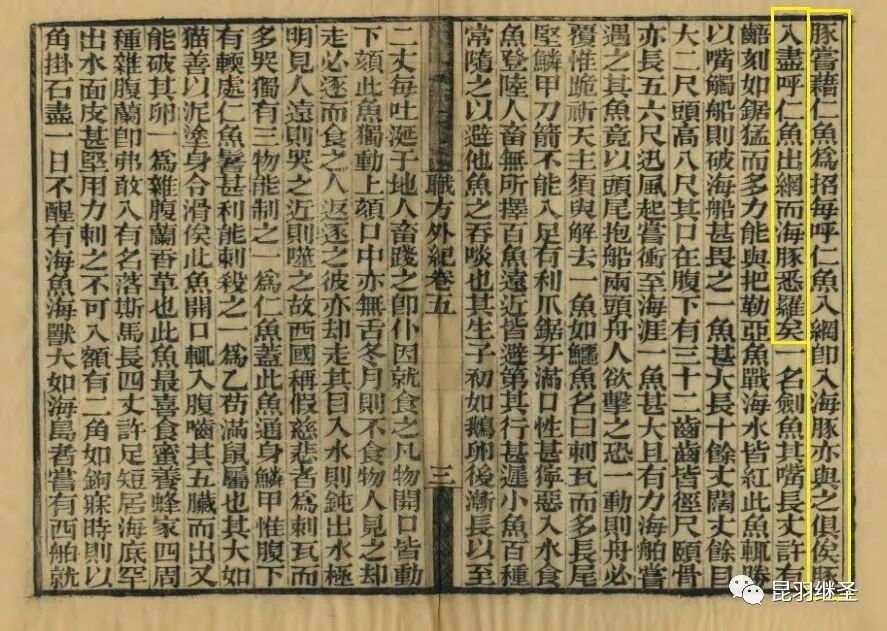一名仁鱼,西书(原文西志)记此鱼尝负一小儿登岸,偶以鬐触伤儿,儿死,鱼不胜悲痛,亦触石死。西国(原文此处并无‘西国’二字)取海豚尝藉仁鱼为招,每呼仁鱼入网,即入海豚,亦与之俱俟。豚入尽,复呼仁鱼出网,而海豚悉罗矣……”