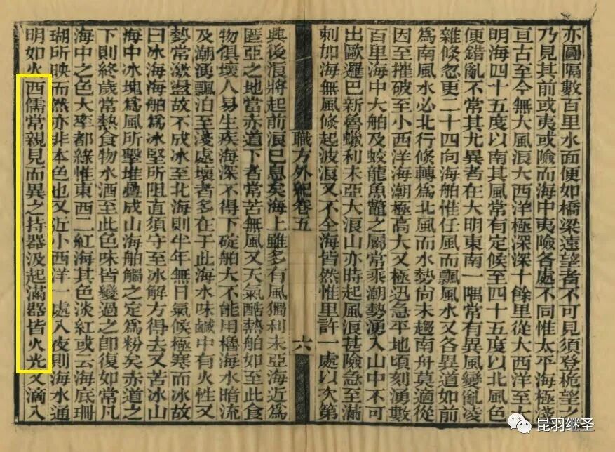 海中珊瑚之属,光景迸照外者,非水之正色也。而西域之小西洋、中国之会稽闽中(记住这段关键性的文字,职方外纪、四库全书、钦定古今图书集成中全部删除了,这是函宇通是中国人所作的有力证据之一,传教士将之改为“西儒”),入夜则海水熊熊有光,汲之置暗室,光照一室。手濡之,则光若自手出。所谓阴火潜然也。