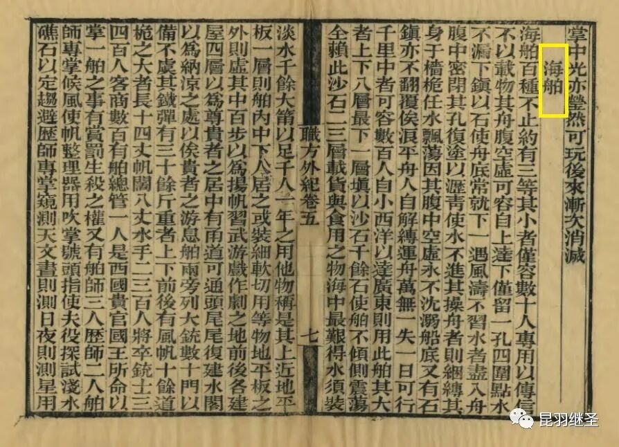 中者可容数百人。自闽粤以达小西洋(此处被职方外纪改为:自小西洋以达广东),战舰贾舶皆然(此句被职方外纪删除)。然在中国,亦称艨艟巨舰矣(此处出现中国字样,职方外纪删除)。