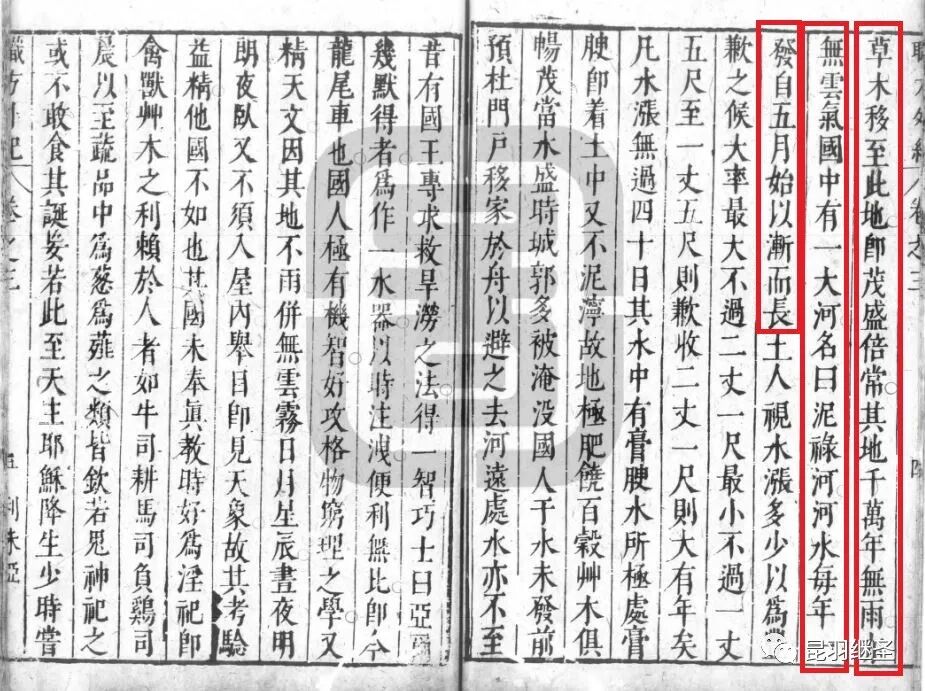 天主教中前知圣人龠瑟者,预令国人罄国中之财,悉用积谷。至荒时,不惟救本国饥,四方来籴,财货尽输入其国,故富厚无比。今五谷极饶,畜产最多,他方百果草木移至此地,茂盛倍常。其地千万年无雨,亦无云气。国中有大河,名曰泥禄河(即尼罗河)。河水每年一发,自五月始以渐而长。土人测水……”